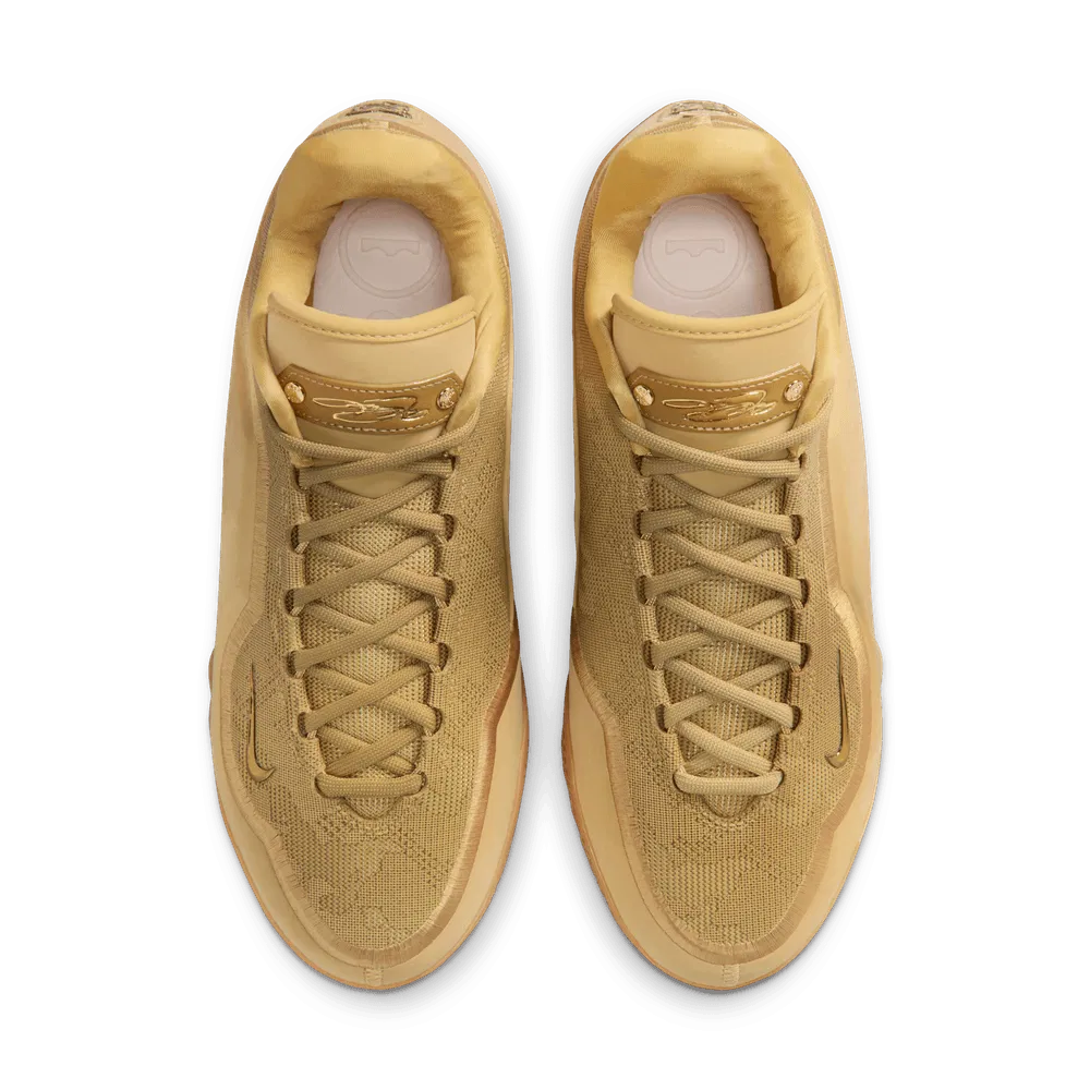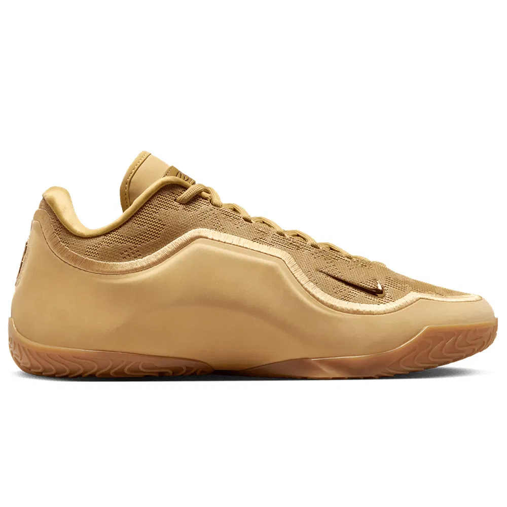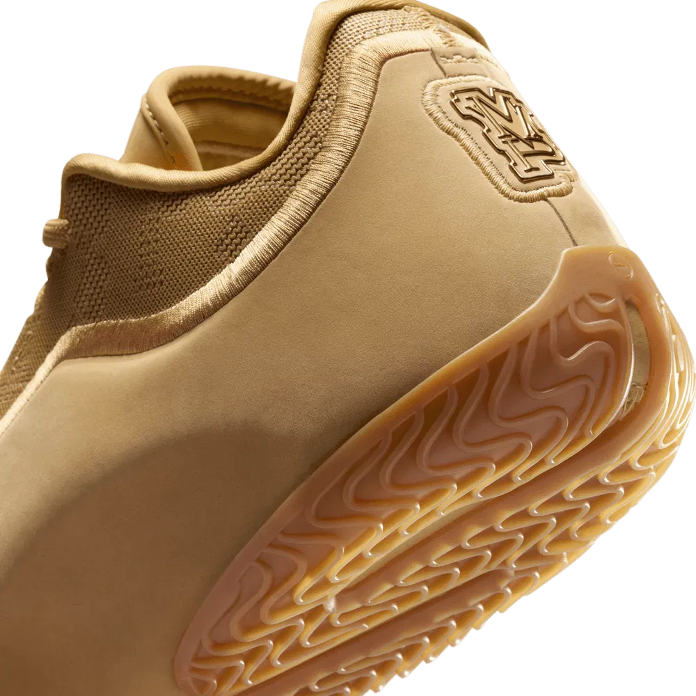 La tige couleur or se distingue ici par sa partie supérieure en daim pour l’occasion, avec également un logo « MVP » sur le talon, et une semelle extérieure marron.