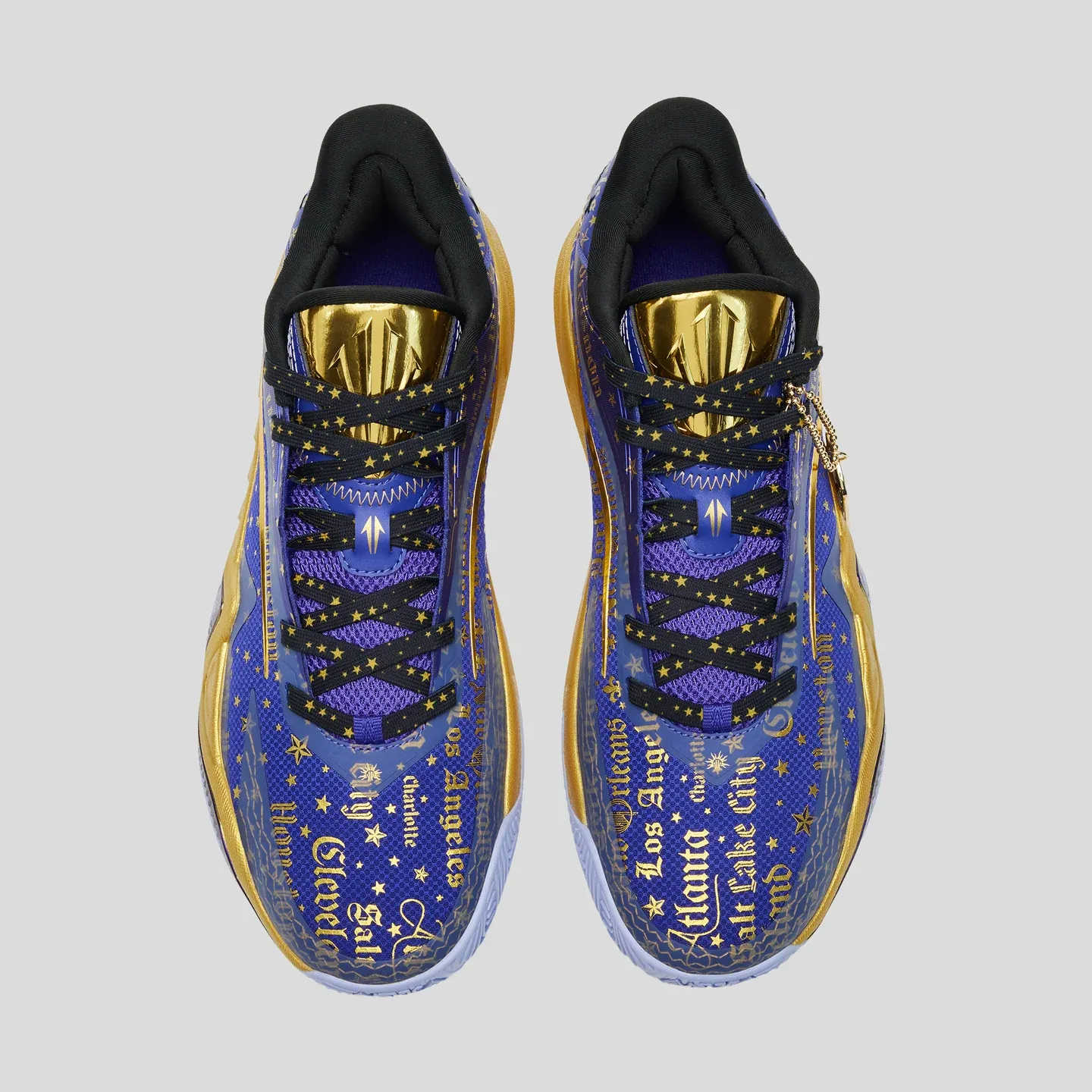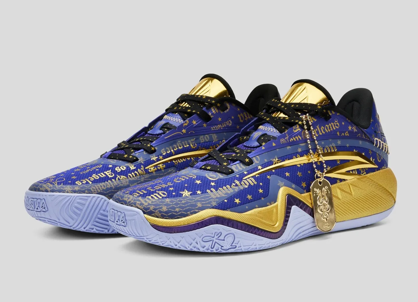 La tige comporte également le nom de plusieurs villes américaines comme Atlanta, Houston, New York ou Los Angeles, assortie d’étoiles dorées. La languette ressort elle aussi en doré, tout comme une partie de la semelle intermédiaire, complétée par une bande en violet et une base d’un violet bien plus clair. Ce nouveau coloris est aussi doté d’un nouveau pendentif !