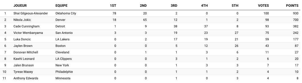 L’arrière du Thunder obtient ainsi 78 des 100 votes pour la première place, contre 18 pour le pivot des Nuggets. De quoi creuser l’écart… alors que c’est Cade Cunningham qui se hisse à la troisième place !