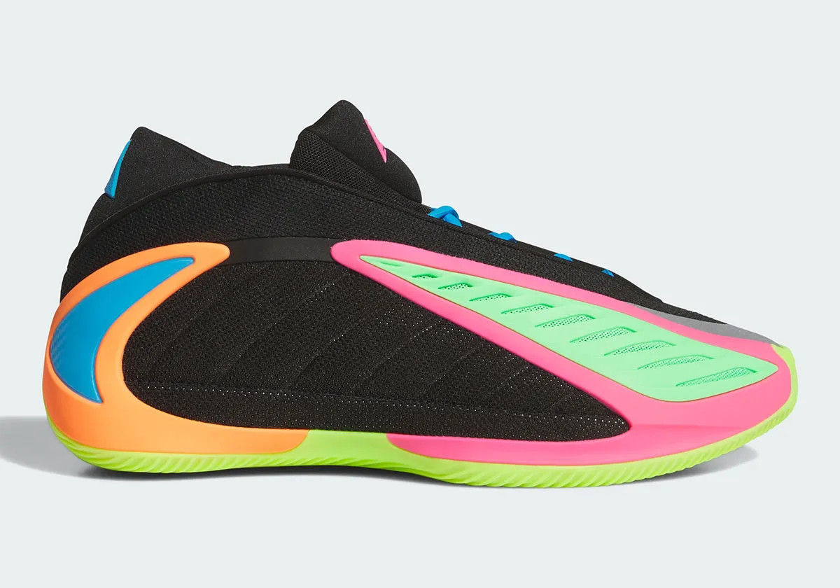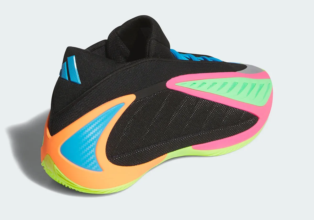 La tige est ici dotée d’une base noire complétée de touches d’orange, de bleu, de vert et de rose, couleur qu’on retrouve également pour habiller les logos du joueur sur la languette, tandis que celui d’adidas sur le talon ressort en bleu. La semelle extérieure apparaît principalement en vert pâle.