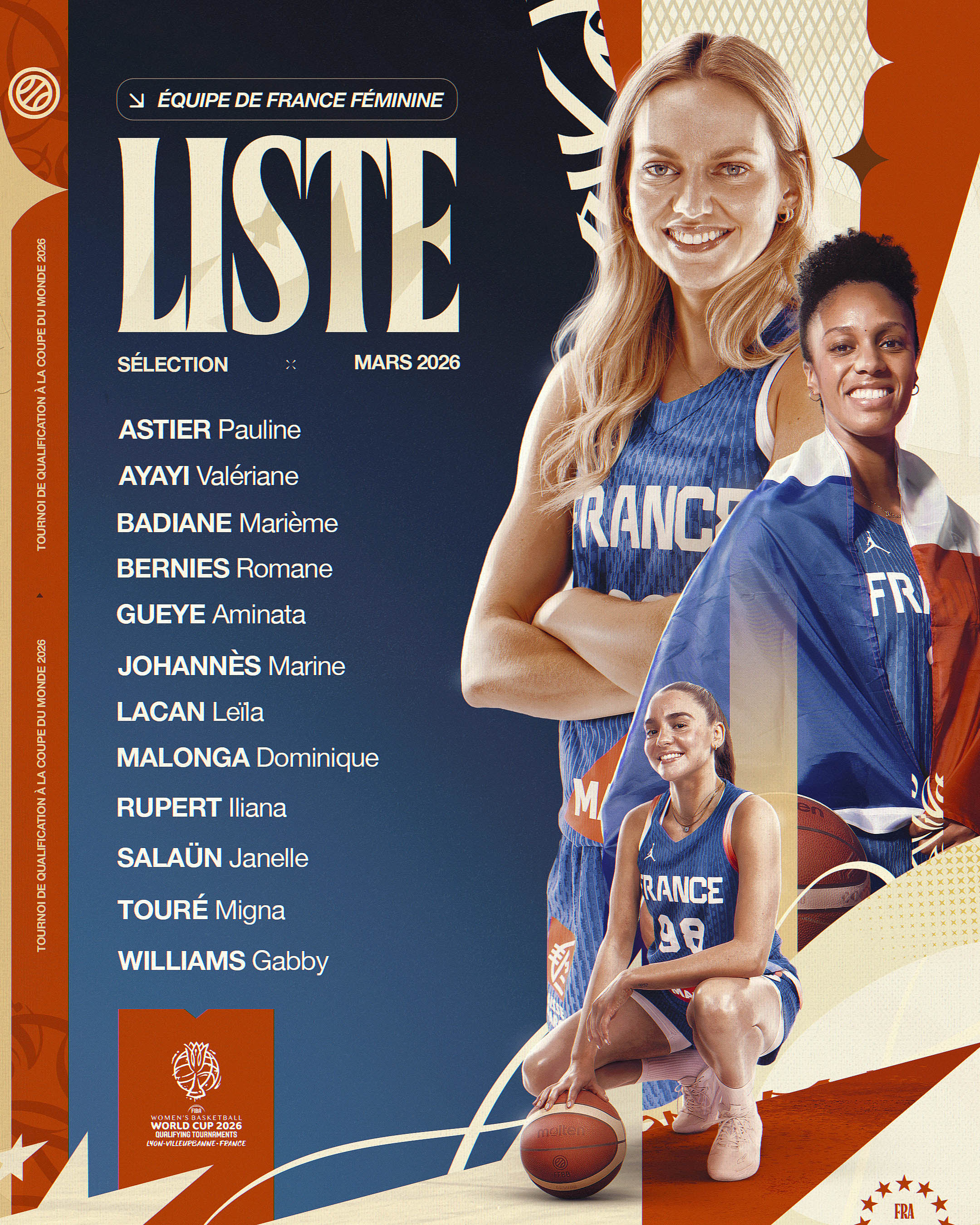 À l’Astroballe de Villeurbanne, la FFBB a dévoilé la liste des 12 Bleues retenues pour le Tournoi de Qualification à la Coupe du Monde 2026, programmé du 11 au 17 mars 2026. Le président Jean-Pierre Hunckler, Jacques Commères (Directeur des Équipes de France) et Jean-Aimé Toupane ont officialisé un groupe à forte ossature olympique.