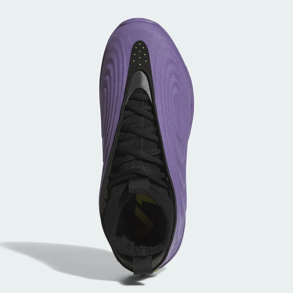 On retrouve donc une large partie en violet pour habiller la tige et une partie de la semelle. Les finitions apparaissent en noir sur la partie supérieure et le col chaussant, en vert pâle pour faire ressortir les trois bandes d’adidas à la base du talon ainsi qu’en vert fluo sous la semelle.