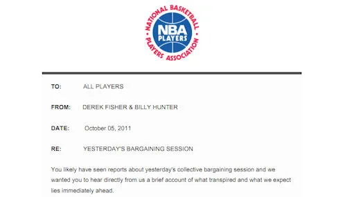 C'est une fois de plus via une lettre envoyée aux joueurs (interceptée par Yahoo! Sports et Sports Illustrated) que le syndicat communique, et Billy Hunter et Derek Fisher tiennent absolument à justifier leur choix de ne pas accepter ce partage des revenus de 50-50 proposé par la NBA.