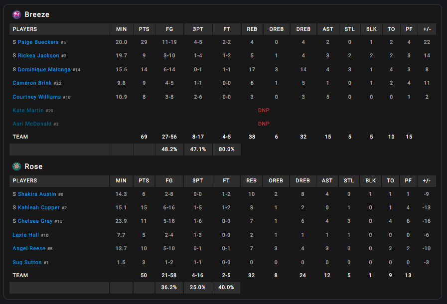Face au Rose, champion en titre de la ligue de 3×3 Unrivaled, le Breeze de Paige Bueckers a pourtant maîtrisé la partie pour largement s’imposer (69-50) en quart de finale de la compétition. La star des Dallas Wings a planté 29 points tandis que Dominique Malonga compilait de son côté 14 points et 17 rebonds !