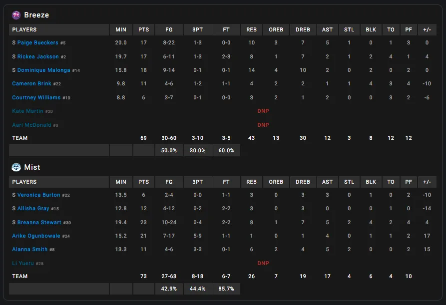 Le problème, c’est qu’elles vont se pétrifier tandis que Breanna Stewart, dans sa salle WNBA, va faire la différence, tant en attaque qu’en défense. Malgré quelques contres de Cameron Brink, elle va attaquer le cercle et forcer la décision tandis que le Breeze va rater les occasions d’arrêter le « momentum » adverse, voire de le récupérer.