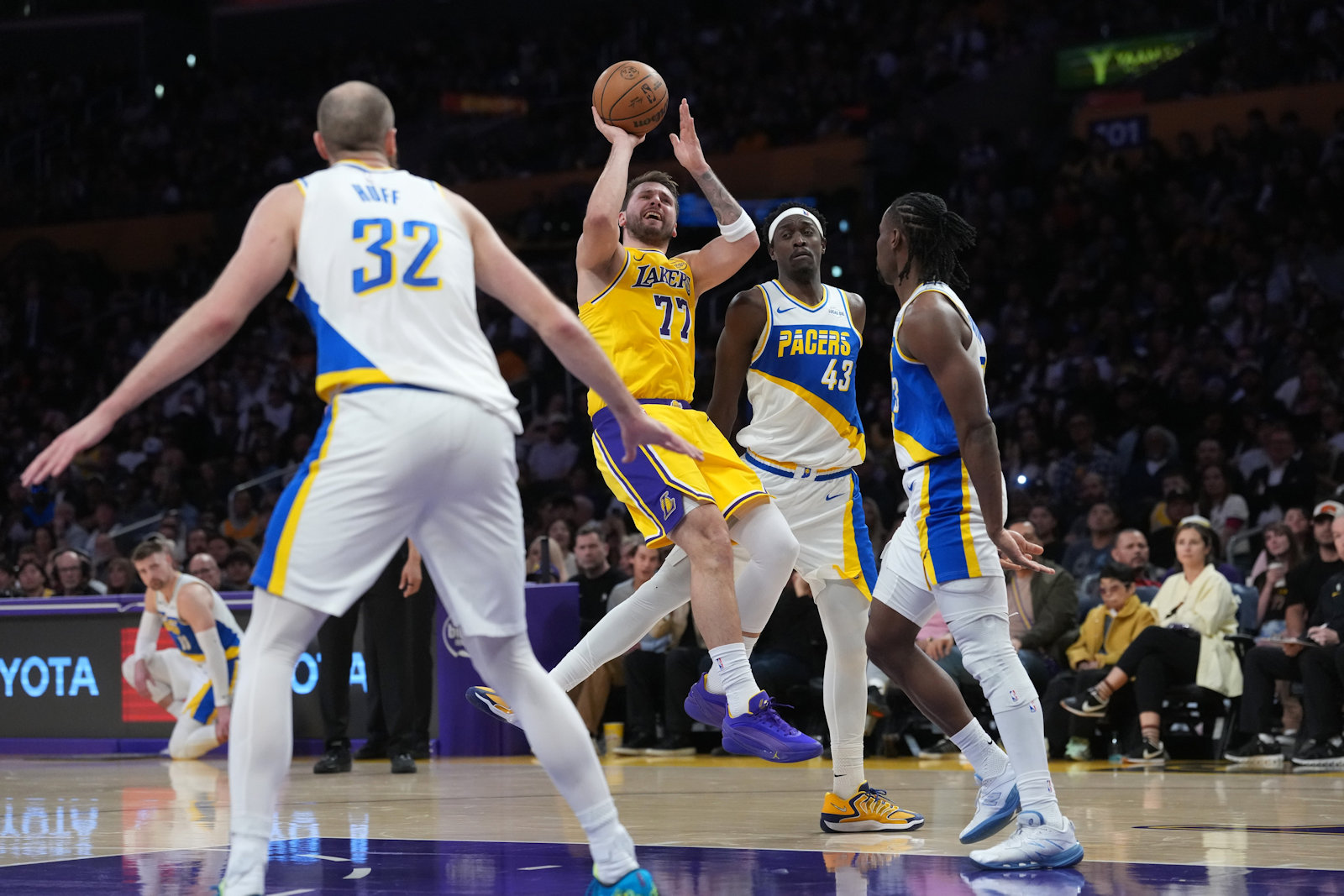 La rencontre démarre sur un tir primé de Jay Huff pour Indiana, immédiatement imité par Rui Hachimura. Les deux attaques sont efficaces en début de match, et les Pacers mènent encore de deux points à un peu plus de six minutes de la fin du premier quart-temps. Puisque les Lakers ont du mal à trouver leurs marques, les Pacers prennent même quatre longueurs d’avance (21-17). La réaction vient alors de Doncic, qui prend complètement feu. Le Slovène enchaîne les tirs primés et mène un impressionnant run de 10-0. Intenable, il réussit ses cinq tirs à 3-points dans le quart-temps et cumule déjà 22 points après douze minutes. Résultat, les Lakers ont inversé la situation pour mener 35-27.