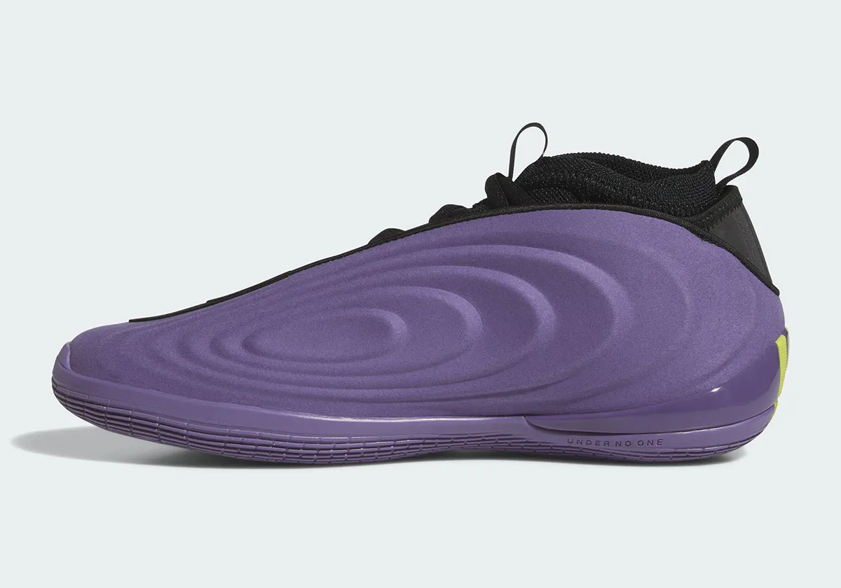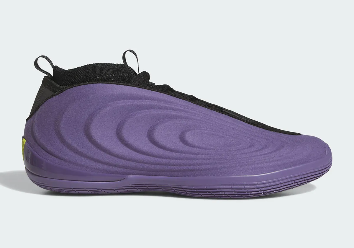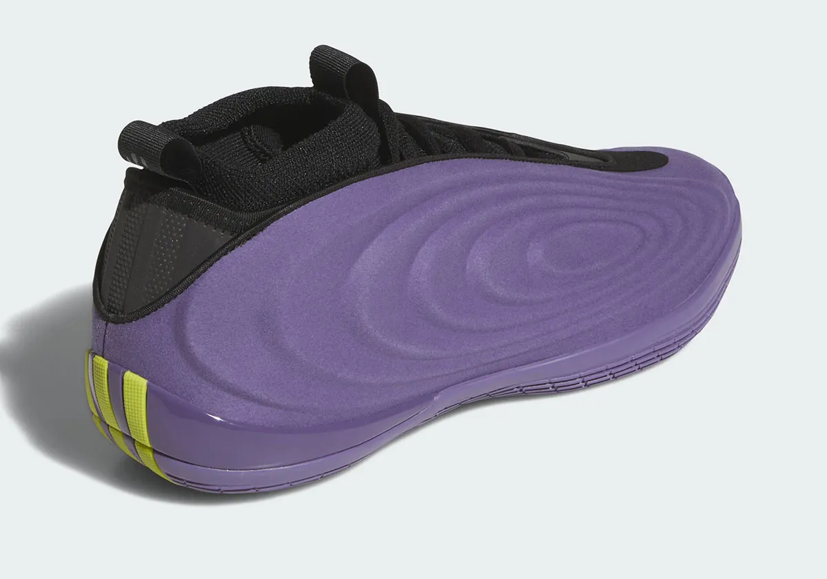 On retrouve donc une large partie en violet pour habiller la tige et une partie de la semelle. Les finitions apparaissent en noir sur la partie supérieure et le col chaussant, en vert pâle pour faire ressortir les trois bandes d’adidas à la base du talon ainsi qu’en vert fluo sous la semelle.