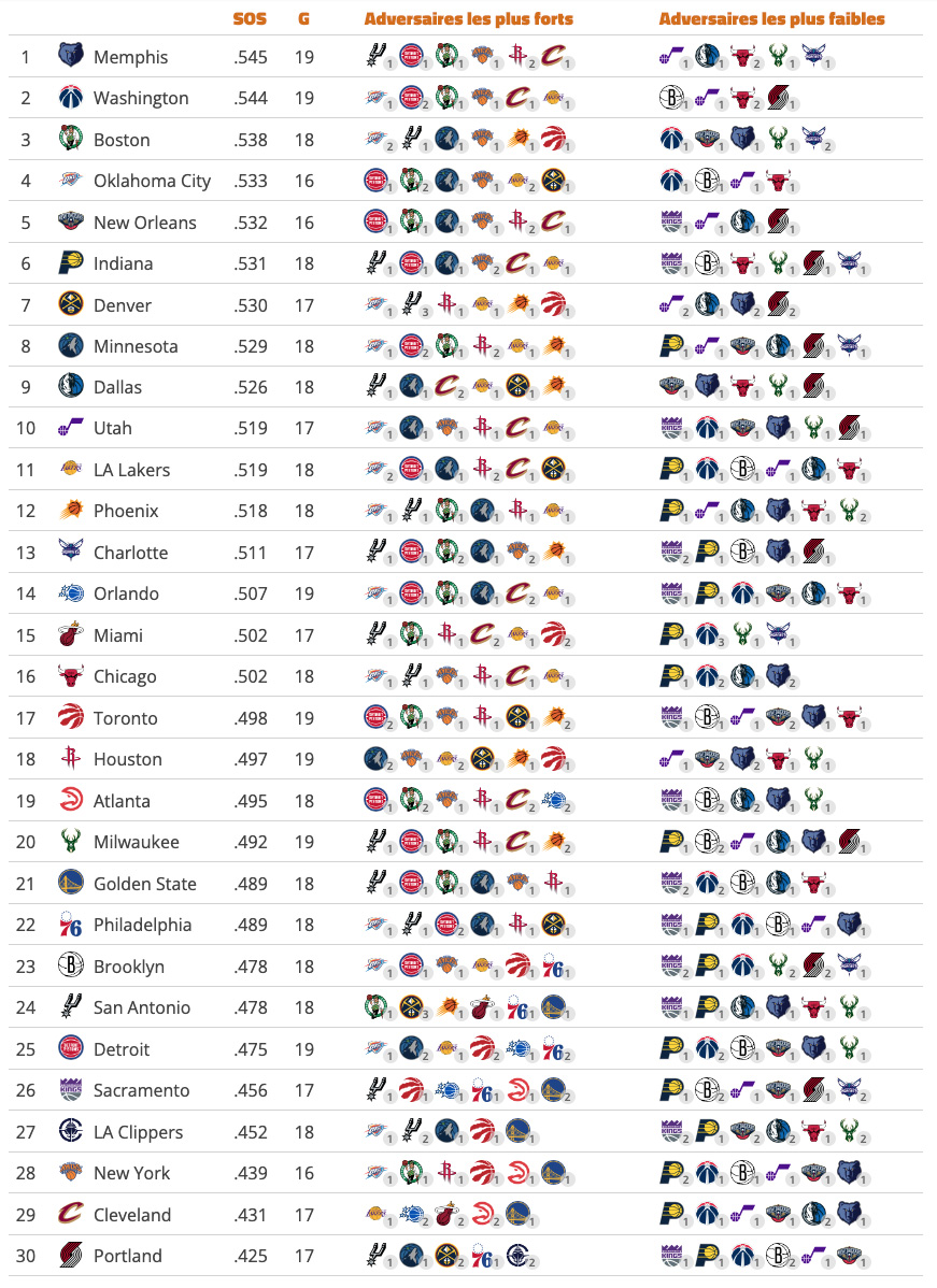 La palme du calendrier le plus « tranquille » revient à Portland (42.5% de « SoS »), qui doit désormais jouer plus de la moitié de ses matchs restants contre des équipes en bilan négatif (9/17).