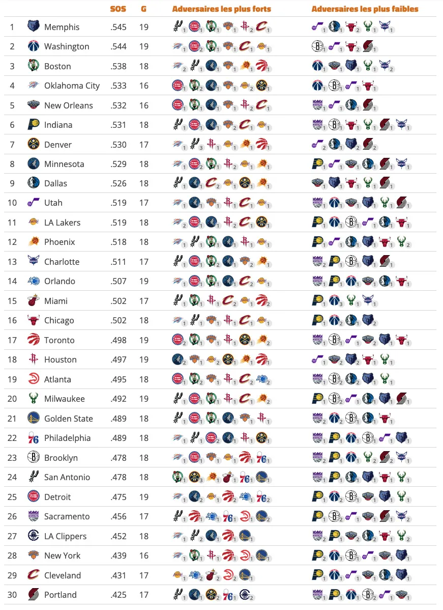 Dans ce contexte, le calendrier peut peser lourd. Pas comme une vérité absolue, bien sûr, mais comme un facteur de contexte à ne pas négliger. La « Strength of Schedule » (SoS), qui mesure le pourcentage de victoires moyen des adversaires à venir, permet d’évaluer ce degré de difficulté. Elle ne prédit pas les résultats, mais elle aide à lire les marges de manœuvre de chaque équipe sur cette fin de saison.