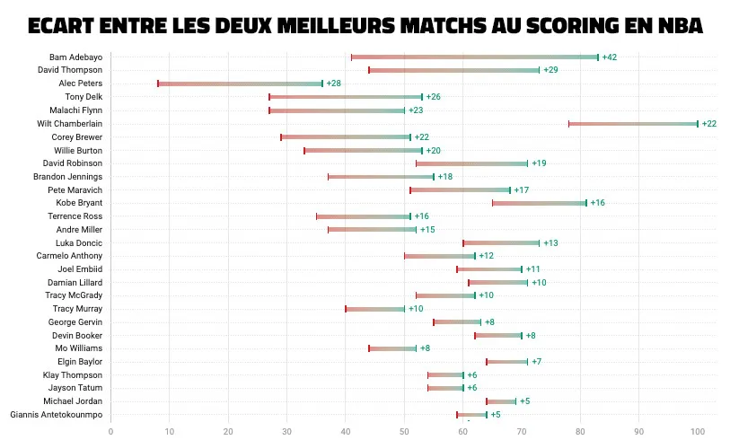 Une bonne manière de visualiser l’improbabilité de cette explosion est d’ailleurs de mesurer la différence entre le meilleur match et le deuxième meilleur match au scoring des joueurs. Bam Adebayo est ainsi passé d’un record de 41 points en NBA, à un record de 83 points. Soit une différence ahurissante de +42 !
