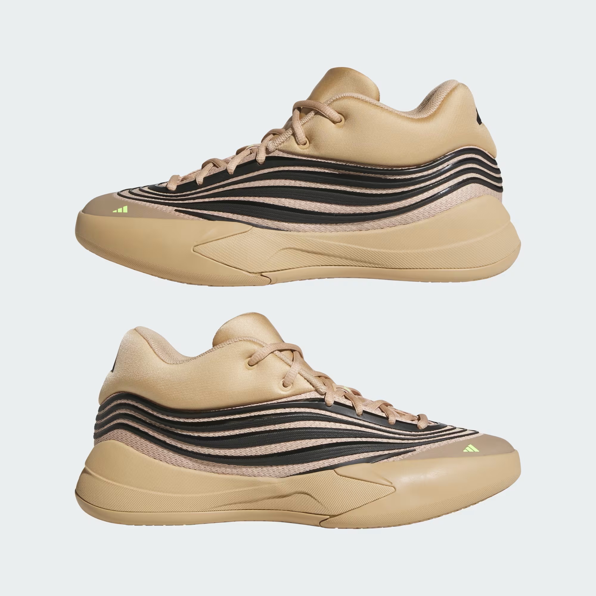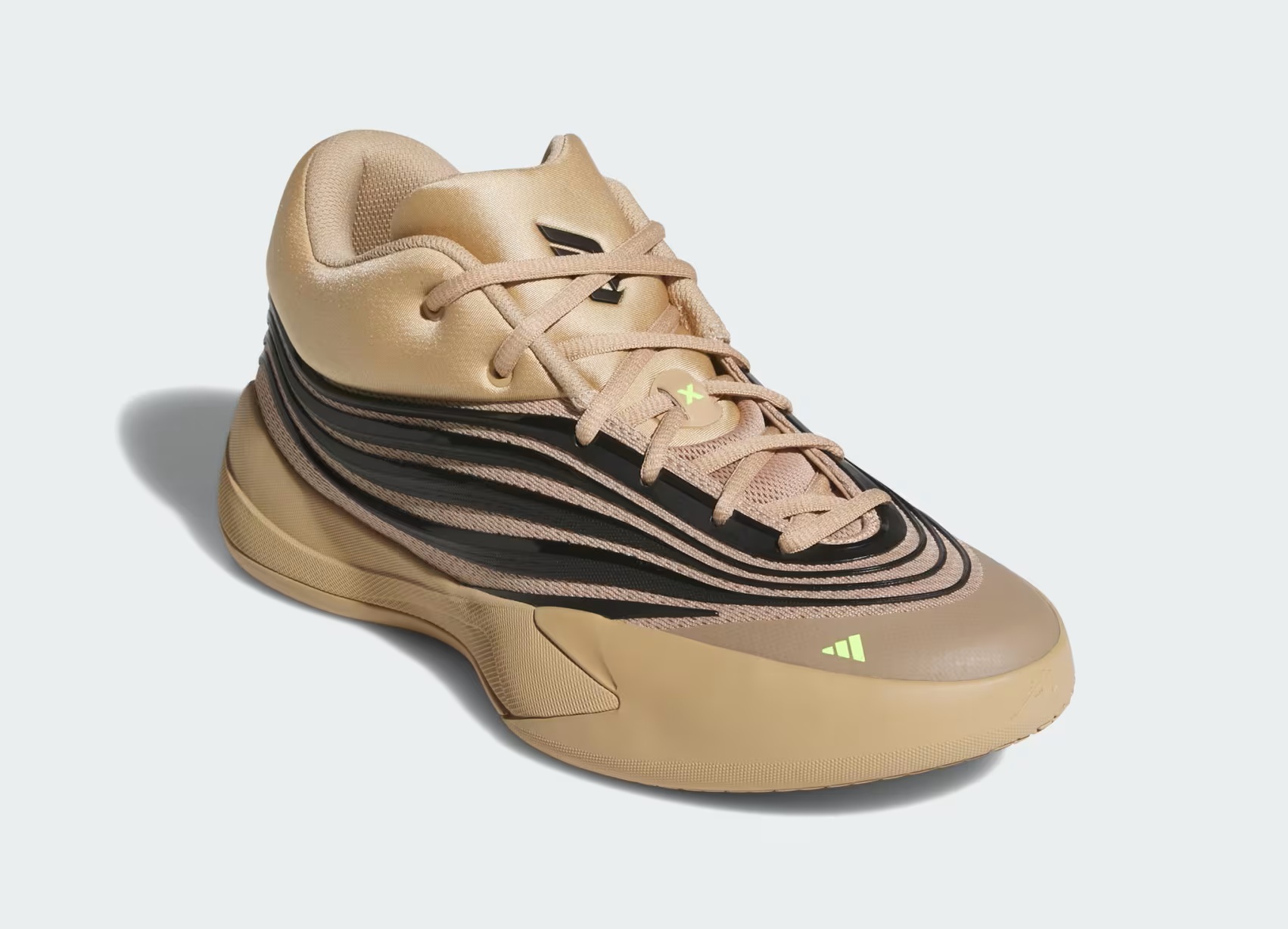 Baptisé « Bay-eige », il s’affiche d’une tige beige parcouru de bandes horizontales noires. Le logo adidas à l’avant du pied et le « X » présent sur les lacets ressortent d’un jaune vif.