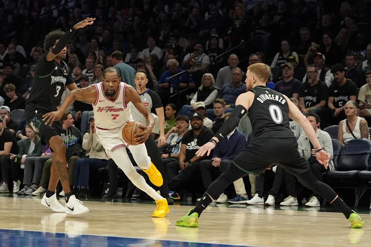 Il reste moins de quatre minutes à jouer. Jaden McDaniels vient de voler un ballon dans les mains de Kevin Durant et file vers un dunk. Les Wolves mènent alors de 11 points. Ce n’est pas fini pour les Rockets mais, dans une rencontre aussi fermée offensivement, c’est un écart qui peut clairement donner la victoire à Minnesota.