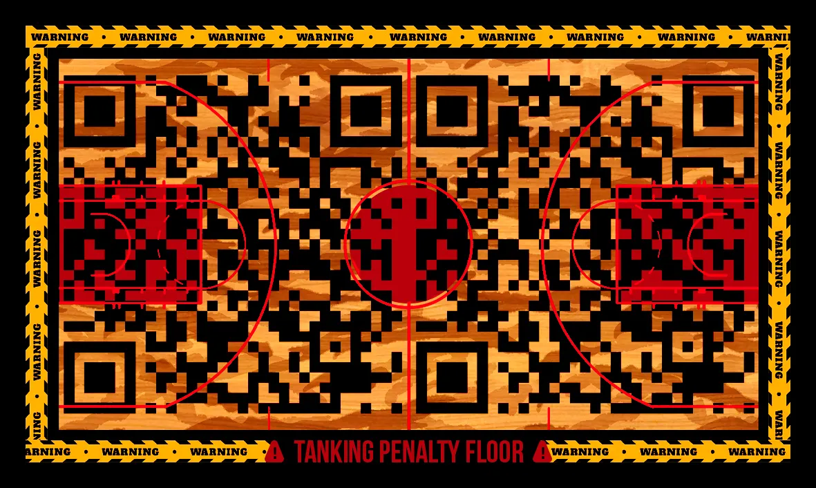 Un parquet impossible à manquer : fond façon QR code géant, marquages rouges agressifs, bandes jaunes « WARNING » tout autour du terrain et une inscription sans ambiguïté le long de la ligne de touche : « TANKING PENALTY FLOOR ». En interne, certains l’appellent déjà le « Floor of Shame », soit le « parquet de la honte ».