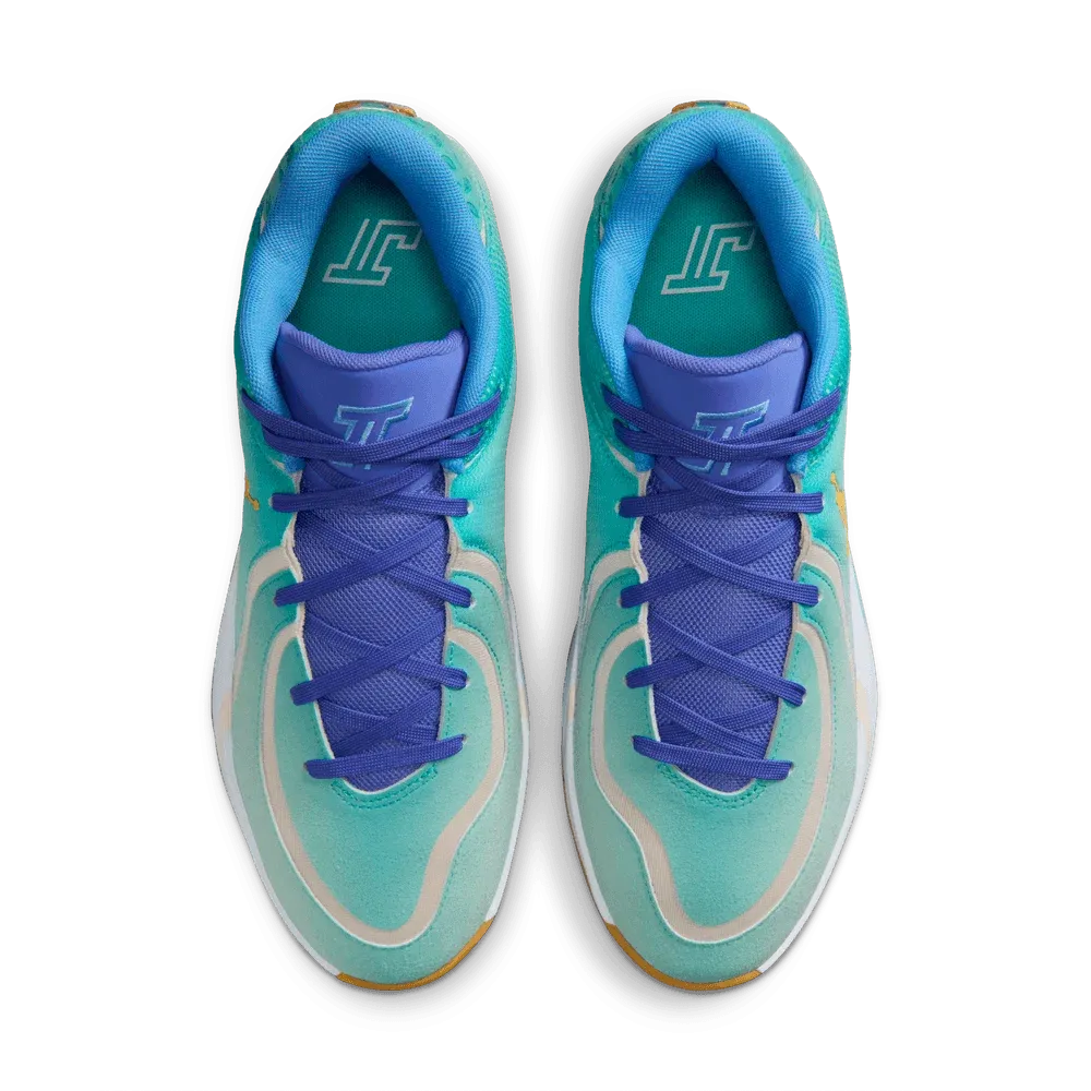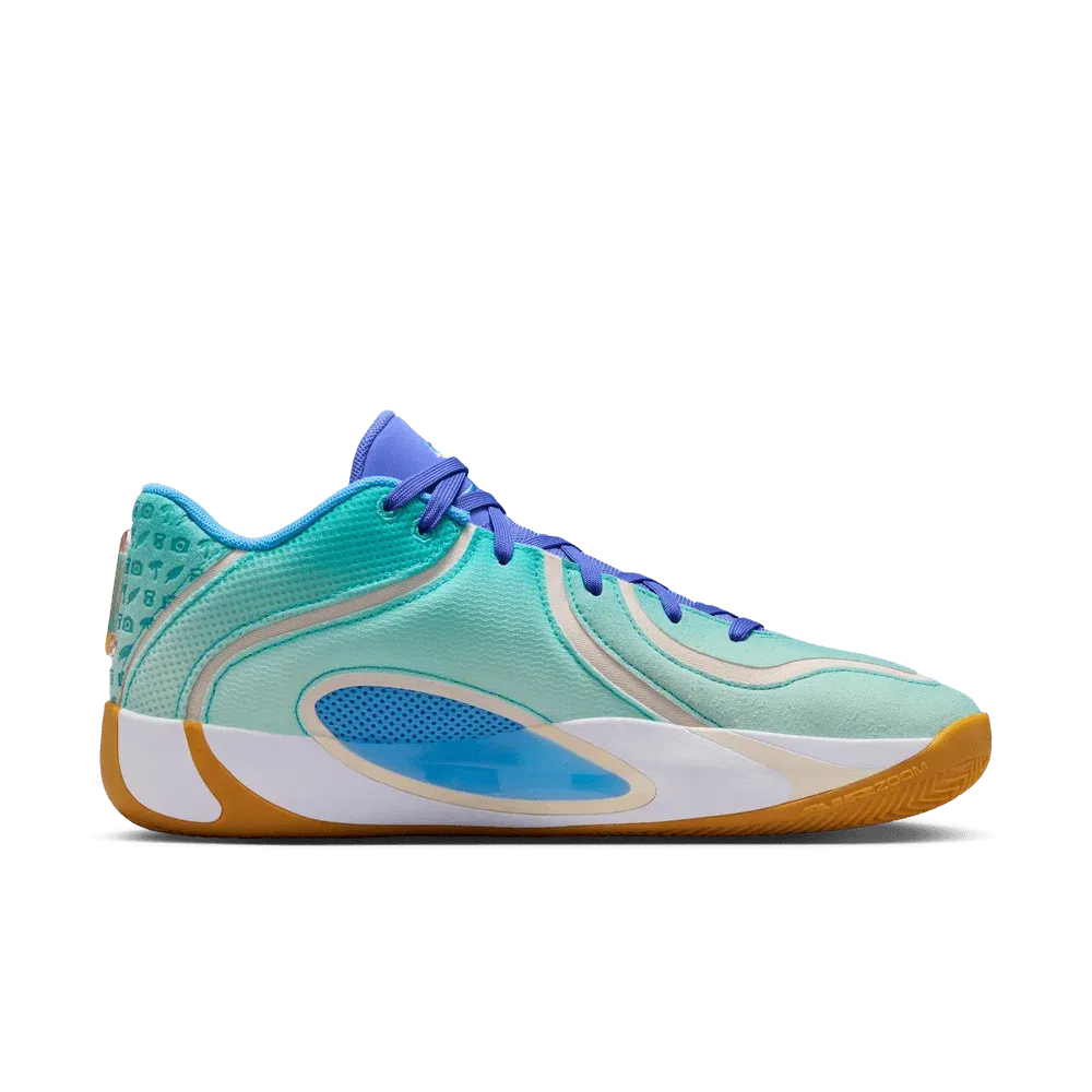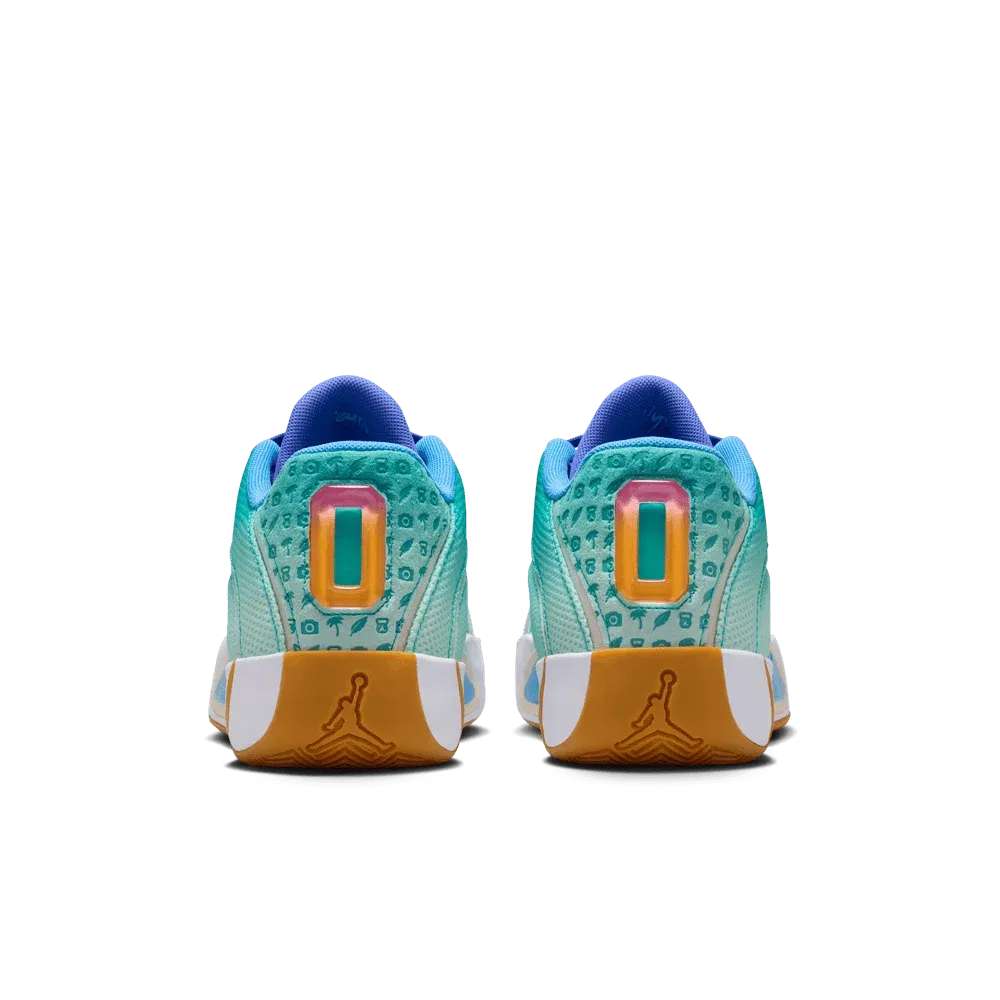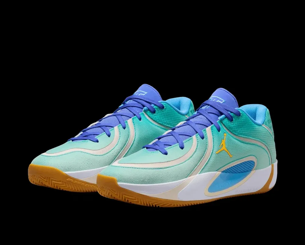 La tige se présente sous un dégradé allant du blanc au bleu clair-turquoise, assortie de bandes blanches et d’un « Jumpman » doré. La languette et les lacets ressortent en violet, tandis qu’une touche d’originalité se situe au niveau du talon, avec la présence de nouveaux motifs comme un appareil photo, une plume ou encore un palmier, autour du traditionnel numéro zéro de Jayson Tatum.
