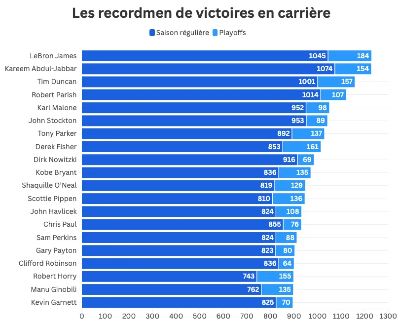 Encore un record pour LeBron James. Déjà meilleur marqueur de l’histoire, et incarnation rare de la longévité au plus haut niveau (en nombre de saisons, de matchs et de minutes disputés…), le « King » devient désormais le joueur ayant cumulé le plus de victoires en carrière. Le dernier succès des Lakers lui a permis d’atteindre la barre des 1 229 victoires, en additionnant saison régulière et playoffs, soit une de plus que Kareem Abdul-Jabbar.