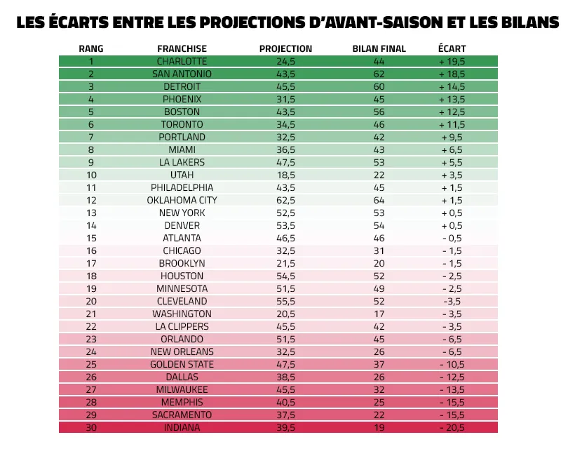 La franchise de Victor Wembanyama signe le deuxième meilleur écart de la ligue : +18,5 victoires par rapport à son total escompté. San Antonio était attendu en progrès avec le développement de son intérieur français et l’intégration de De’Aaron Fox, mais passer de 34 à 62 victoires en une saison relève du tour de force.