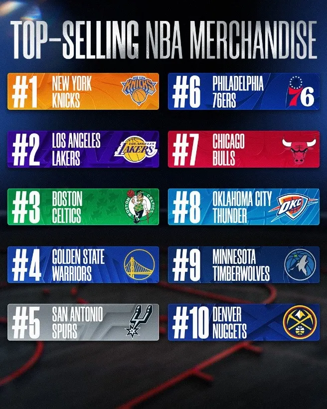 Au niveau des équipes, on retrouve les « suspects habituels » avec les Knicks à la première place des maillots les plus vendus, suivis des Lakers, des Celtics et des Warriors. Les Spurs sont eux en cinquième position.