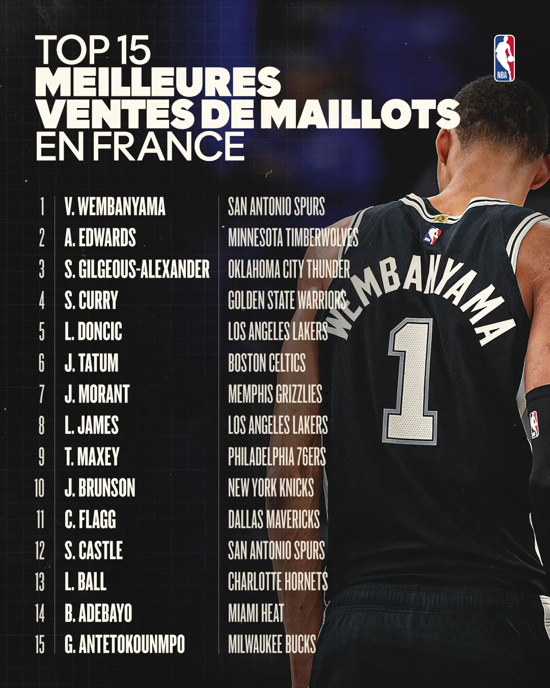 Devancé par Stephen Curry, Luka Doncic et Jalen Brunson à l’échelle globale, Victor Wembanyama est en revanche le plus gros vendeur de maillots à l’échelle française.