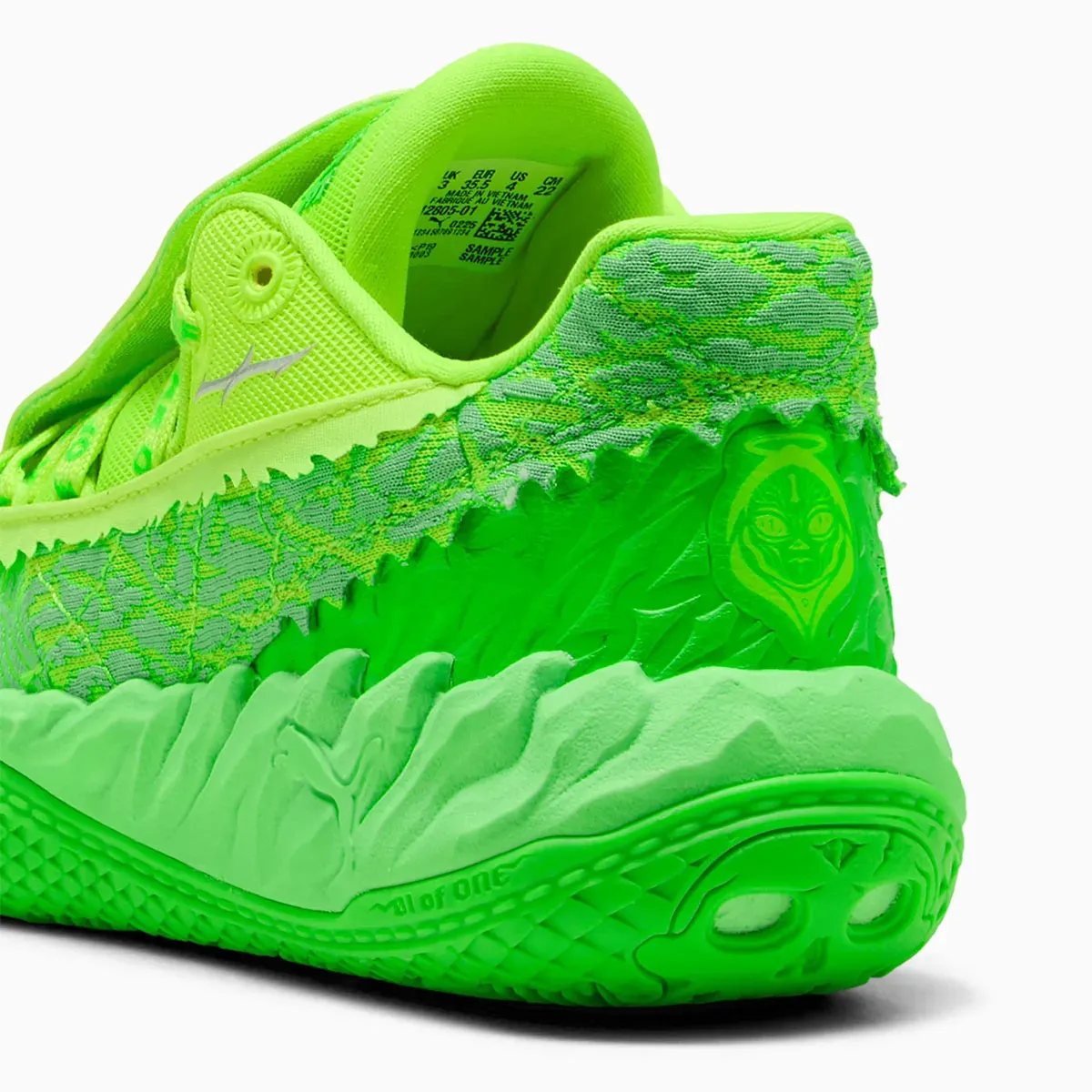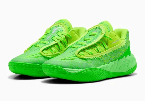 Puma en profite évidemment pour mettre la MB.05 en avant, et fait cette fois honneur à la toute nouvelle version Low de la paire. Baptisée «MB.05 Lo», elle avait déjà été mise en avant lors du All-Star week-end. La voilà de retour dans une version «Flourish» entre vert et vert clair assortie de touches de gris, et présente cette année comme particularité, ce «cache lacet», apposé comme une feuille sur la partie centrale supérieure de la chaussure, et un nouveau motif au niveau du talon tiré de l’un des nombreux tatouages du joueur, remplaçant le traditionnel logo phénix.