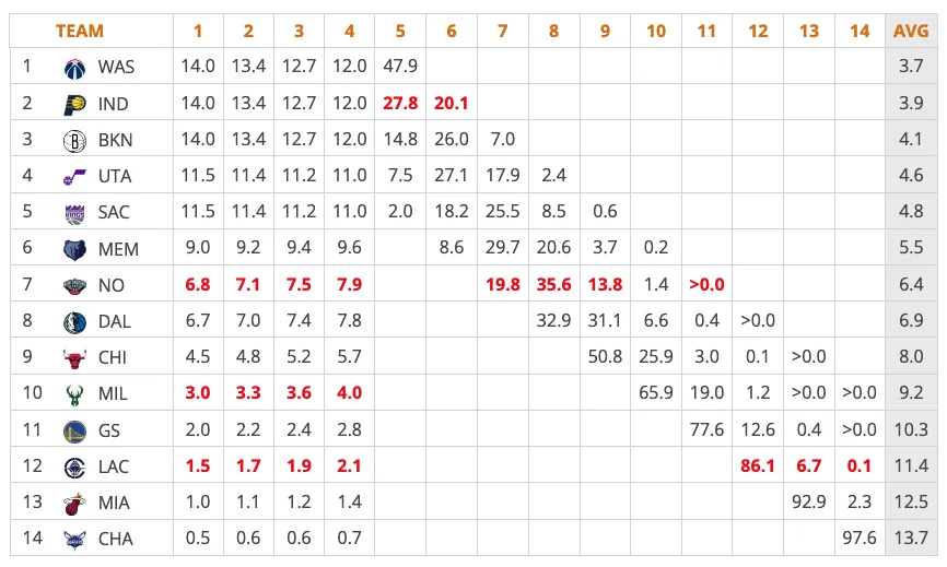 Pour leur part, les Clippers pourraient (47,9 %) récupérer le choix du premier tour des Pacers s’il tombe à la 5e ou à la 6e place, conséquence de l’échange impliquant Ivica Zubac lors de la « trade deadline ».