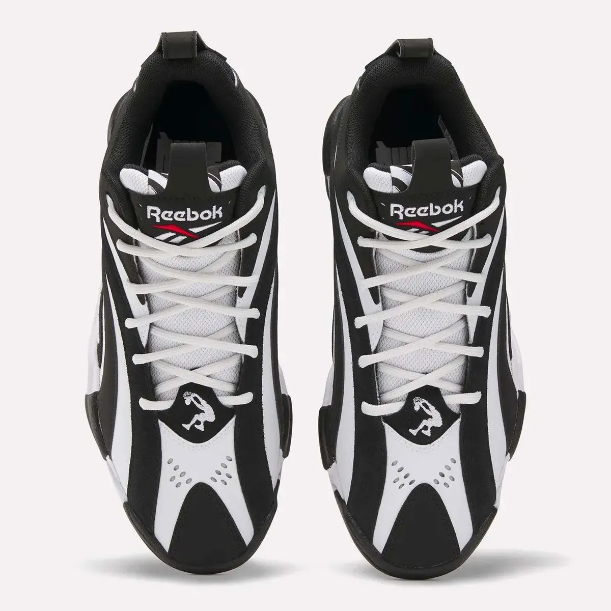 Les bandes en noir et blanc entre daim et cuir sont ici complétées par une touche de rouge sur le logo « Vector » de Reebok, sur la languette, le talon et sous la semelle. On retrouve également le fameux logo « Dunkman », représentant la silhouette du Shaq, brodé sur l’avant du pied.