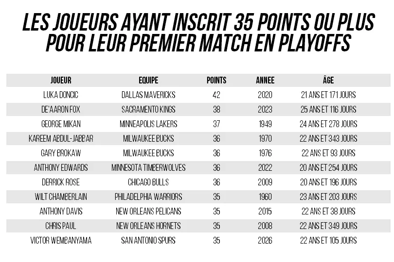 Réussir sa première en playoffs n’a rien d’anodin. Si l’on retient davantage les derniers matchs, ou ceux à l’enjeu plus grand, une première impression réussie est l’occasion de faire passer un message, et bien souvent de lancer une série du bon pied. Demandez à Victor Wembanyama, devenu le premier joueur de l’histoire dimanche à marquer 35 points tout en inscrivant cinq paniers à 3-points pour ses débuts en postseason.