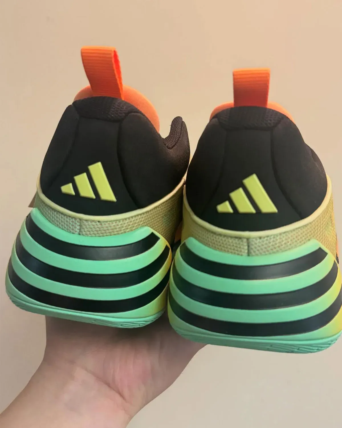 La languette laisse entrevoir le logo « Spida » en noir, tandis que les trois bandes d’adidas apparaissent sur le talon. Le renfort à la base du talon est cette fois habillé de bandes horizontales.
