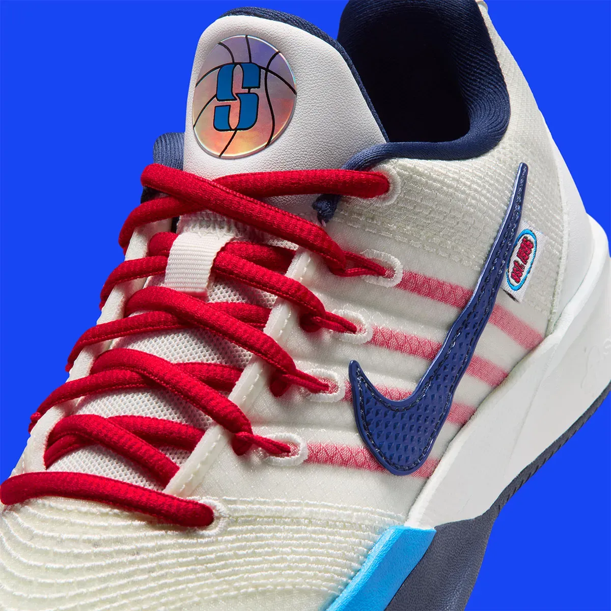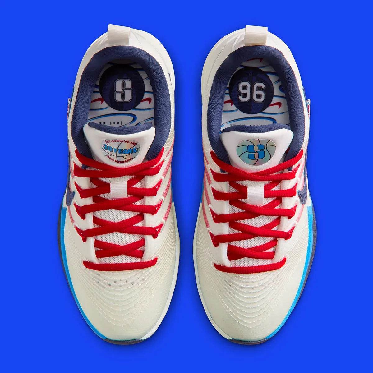 La tige en blanc assortie de finitions en rouge et bleu est complétée de logos inédits pour l’occasion sur la languette, avec un « S » sur la chaussure gauche tandis que la pastille sur la chaussure droite laisse apparaître la mention « 30 Years Anniversary » ainsi que la date «April 24 1996 » rappelant les premiers pas d’une ligue qui n’a jamais été aussi prisée, 30 ans plus tard !