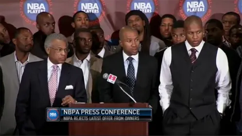 A nouveau, Billy Hunter et Derek Fisher sont venus devant la presse. Cette fois, 42 joueurs étaient derrière eux alors que le meneur des Lakers expliquait que l’association des joueurs n’accepterait pas l’offre actuelle de la NBA, malgré l’ultimatum posé par David Stern et qui se termine demain à 23 heures.