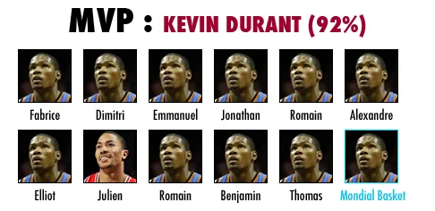 Meilleur scoreur de la NBA, Kevin Durant semble partir avec une longueur d'avance. LeBron James, qui devrait moins jouer cette saison, n'est pas cité. Seul Julien croit au doublé de Derrick Rose. Si on devait citer des outsiders, on pense à Chris Paul ou Blake Griffin si les Clippers se hissent au sommet de la conférence Ouest.