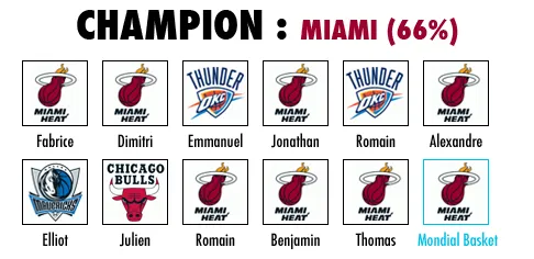 Le Thunder est l'équipe la plus citée comme finaliste face au Heat. Chicago et Dallas n'apparaissent qu'une fois, mais ce serait une somptueuse affiche. Les Lakers, les Spurs ou encore les Celtics n'apparaissent pas dans nos votes. Ni New York.