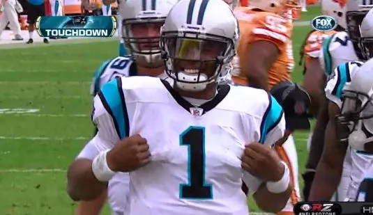 Un geste adressé à Cam Newton (le QB des Carolina Panthers), présent au premier rang, et qui signe ses touchdown de cette manière.