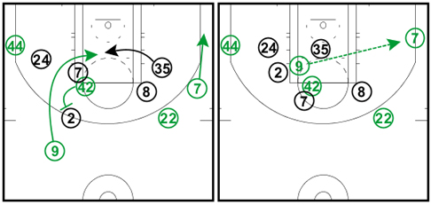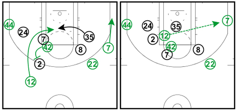 Un pick-and-roll qui permet l’attaque de la défense et on profite de la deuxième aide pour servir le shooteur qui se retrouve tout seul.