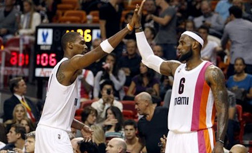 30 points pour l’un, 28 pour l’autre. 7 rebonds pour l’un, 9 rebonds pour l’autre. 5 passes pour les deux, et 5 contres à eux deux. L’un est Chris Bosh, l’autre est LeBron James.