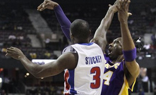 Mais, face à des Pistons courageux et qui ne lâchent rien, ce n’est pas Bryant qui maintient les Lakers mais plutôt le secteur intérieur. Andrew Bynum est énorme (30 pts, 14 rbds), ce qui fait perdre beaucoup d’énergie à Greg Monroe pour défendre sur lui (15 rbds, mais seulement 2 pts à 1/10). Même chose pour Pau Gasol (20 pts, 10 rbds) mais Jason Maxiell, plus expérimenté, le tient beaucoup mieux.