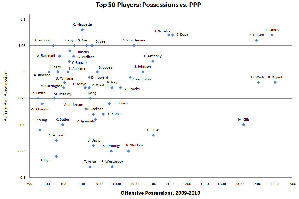 Plusieurs choses sautent aux yeux sur ce graphique. Tout d’abord, on constate naturellement que les 6 meilleurs marqueurs de la ligue font partie des joueurs ayant le plus de possessions offensives depuis le début de la saison. Carmelo Anthony étant légèrement en retrait, mais cela s’explique aussi par le fait que Melo ait raté 13 matchs en janvier. En revanche, on constate que des joueurs comme Chris Bosh, Dirk Nowitzki, ou encore Brandon Roy, touchent “moins” le ballon sur les phases offensives, mais ils sont presque tout aussi efficaces. Même chose pour Tim Duncan et Gerald Wallace.