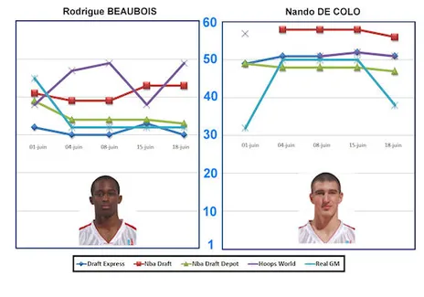 On ne sera donc pas surpris de voir que leur cote reste stable ou grimpe. Beaubois est toujours annoncé en fin de premier tour, début du 2eme. Pour De Colo, ce serait plutôt du milieu de second tour mais Real GM lui prédit une place plus élevée.