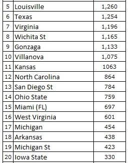 Ont également reçu des votes : Northern Iowa 83, Connecticut 76, Oklahoma St 69, Providence 56, Virginia Commonwealth 52, Syracuse 49, Florida 40, Georgetown 30, Creighton 29, Washington 17, NC State 12, Wyoming 10, California 8, Seton Hall 5, St. John’s 5, Nebraska 4, Baylor 3, UCLA 3, Ole Miss 2, Old Dominion 2, TCU 2, Notre Dame 1, Saint Mary’s 1.