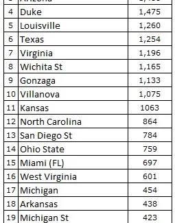 Ont également reçu des votes : Northern Iowa 83, Connecticut 76, Oklahoma St 69, Providence 56, Virginia Commonwealth 52, Syracuse 49, Florida 40, Georgetown 30, Creighton 29, Washington 17, NC State 12, Wyoming 10, California 8, Seton Hall 5, St. John's 5, Nebraska 4, Baylor 3, UCLA 3, Ole Miss 2, Old Dominion 2, TCU 2, Notre Dame 1, Saint Mary's 1.