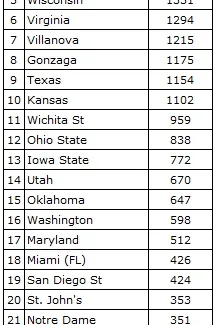 Ont également reçu des votes : Baylor 97, TCU 80, Colorado St 75, Northern Iowa 65, Georgetown 41, California 37, Arkansas 19, Seton Hall 14, Virginia Commonwealth 6, Old Dominion 4, LSU 4, Oklahoma St 4, Penn State 3, Davidson 1.