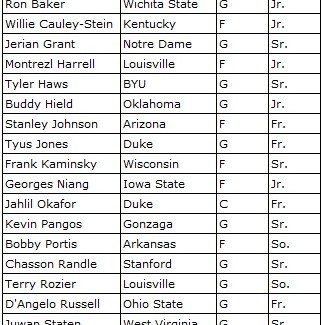 Kentucky, seule équipe encore invaincue cette saison, n’est représenté que par un seul joueur, Willie Cauley-Stein. Parmi les autres prétendants se trouvent Frank Kaminsky, l’un des favoris d’avant-saison, mais aussi Tyler Hawks, le scoreur de BYU, ou encore le duo de Gonzaga composé de Kevin Pangos et Kyle Wiltjer.