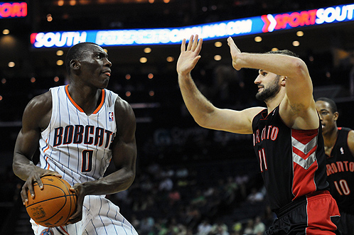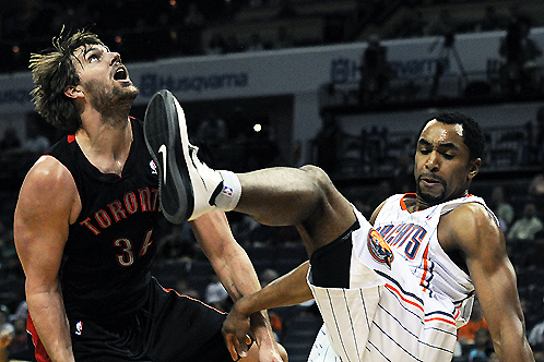 Côté terrain les Raptors débarquent diminués par la blessure à la cheville de Jose Calderon qui sera remplacé à la mène par Jerryd Bayless. Pour couronner le tout, leur avion a eu un problème technique et s’est arrêté en catastrophe à Memphis où ils ont passé une nuit agitée avant de gagner la Caroline du Nord. En ce qui concerne les Bobcats, Boris Diaw en instance de départ est en costume dans les tribunes. Il a le regard figé de ceux qui en ont gros sur la patate. Le divorce est déjà bien consommé avec le coach Paul Silas et dans quelques jours il partira vers d’autres cieux après avoir joué 258 matchs de rang pour Charlotte, record de la franchise. En discutant avec un journaliste du Charlotte Observer, j’apprends que les relations étaient devenues tendues entre les deux hommes, Silas lui reprochant un certain manque d’intensité à moins que ce ne soit un excès d’intelligence, ou plutôt le reproche inavoué que le basket n’est pas tout dans sa vie. Dans le cinq de départ ce soir, on observe donc la titularisation de l’intérieur congolais Bismack Biyombo qui est le joueur le plus jeune de la NBA du haut de ses 20 printemps.