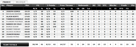 Finalement, les Français l’emportent 82-44 grâce à un très bon duo Batum/Pietrus. Mais la maladresse des Français aux lancers francs continue à inquiéter. Enfin Petro a définitivement gagné sa place après avoir réalisé un bon match. Ajinca n’a pas joué à cause d’une douleur lombaire ressentie à l’échauffement.