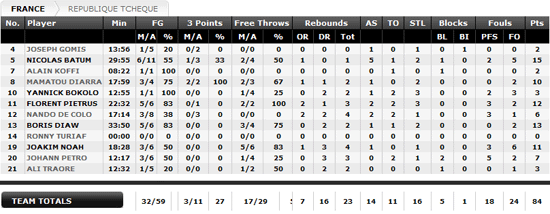 Avec Tony Parker toujours au repos, l’équipe de France s’est encore imposée, cette fois face aux Tchèques (84-66). Des Tchèques qui avaient d’ailleurs battus l’Italie il y a une semaine. Grâce à nouveau à un très bon Nicolas Batum (15 points, 5 passes) et un Florent Pietrus toujours très actif (12 points, 3 rebonds, 3 interceptions), les Bleus ont résisté au retour de leurs adversaires pour s’assurer une victoire somme toute tranquille. En attendant le résumé du match qui devrait arriver rapidement, on vous propose de jeter un oeil à la feuille de matchs et aux trois vidéos suivantes.