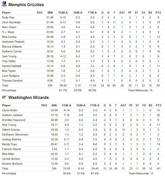 A l’arrivée, les Wizards s’imposent 101-92 grâce aux 20 pts de Jamison, et aux 15 de Caron Butler. Côté Grizzlies, premier double double pour Zach Randolph (10 pts, 11 rbds).