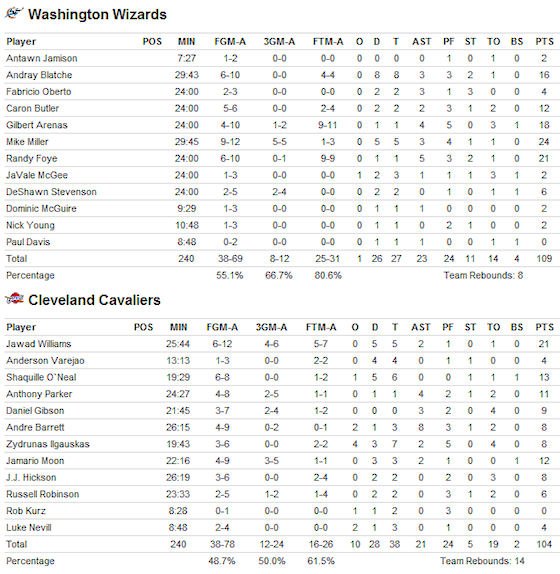 Encore moins de chance côté Wizards puisqu’Antawn Jamison a quitté la salle avec le bras en écharpe. L’intérieur de Washington s’est blessé à l’épaule en tentant de contrer Zydrunas Ilgauskas, et il pourrait être absent plusieurs semaines…