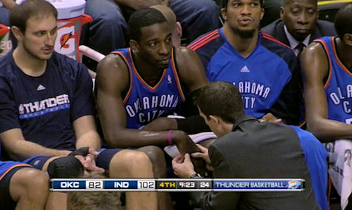 Mais le pire était à venir pour le Thunder. Une faute de Danny Granger sur la main droite de Jeff Green apparemment anodine. Mais Green va se plaindre aux arbitres. Il met les deux lancers, mais il souffre. Il rejoint le banc, et le kiné du Thunder n’a pas l’air optimiste.