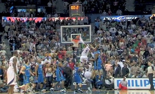 Alors Vince Carter enfile son costume de “clutch player”. Il égalise grâce à un superbe tir à 3-points (84-84). Il reste 10 secondes à jouer.