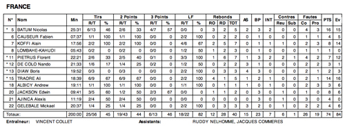 Difficile de tirer des conclusions sur le secteur intérieur français tant la différence de niveau y semblait forte. Ali Traoré a parfaitement assumé son rôle de finisseur. Alain Koffi et Florent Pietrus ont été précieux en défense. Alexis Ajinça a toujours du mal à se situer en défense, cherchant trop souvent le contre. En attaque, il hésite beaucoup. Comme de Colo, il veut bien faire. Mais son rendement reste inquiétant à l’approche d’une grande échéance, comme le notait Vincent Collet.