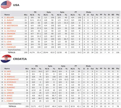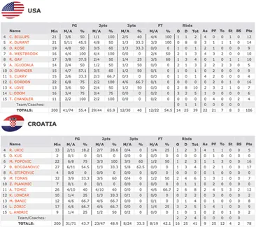 En face, Marko Popovic, Bojan Bogdanovic et Ante Tomic maintiennent les croates à flots. Ils essaient bien d'appuyer à l'intérieur mais les mains actives et le physique américains les empêchent de s'y imposer. Et les Etats-Unis finissent en roue libre pour une première victoire aisée.